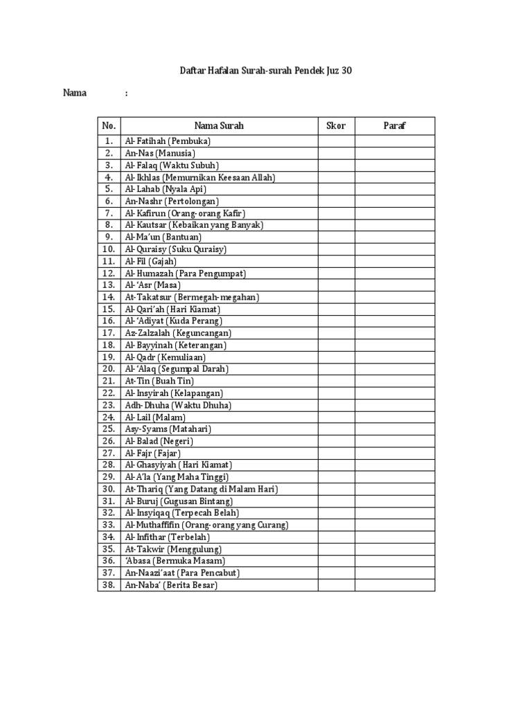 | Judul Surah: Daftar Nama Nama Surah Juz 30 |